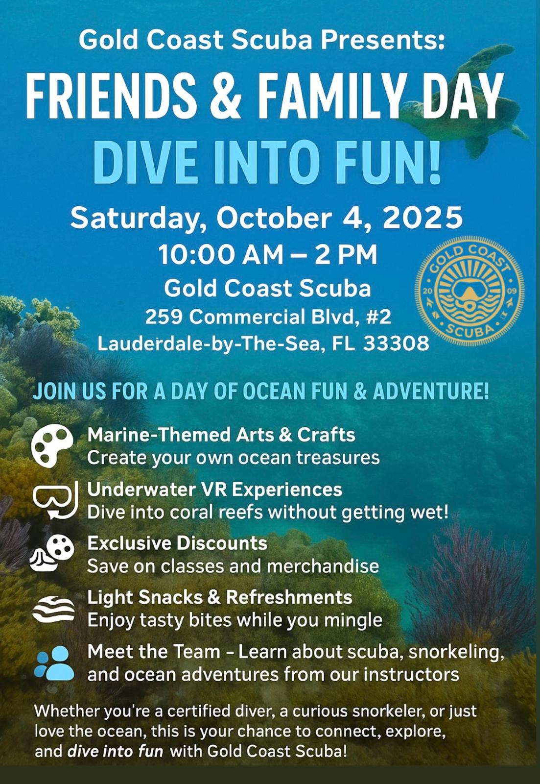 You are invited to stop in and join us for this fun & free event, Friends & Family Day! We will have immersive VR experiences, displays of our products, meet and greet with Instructors and Dive Masters, and receive discounts on future learning opportunities such as Discover Scuba Diving, Open Water Certifications & Refreshers!